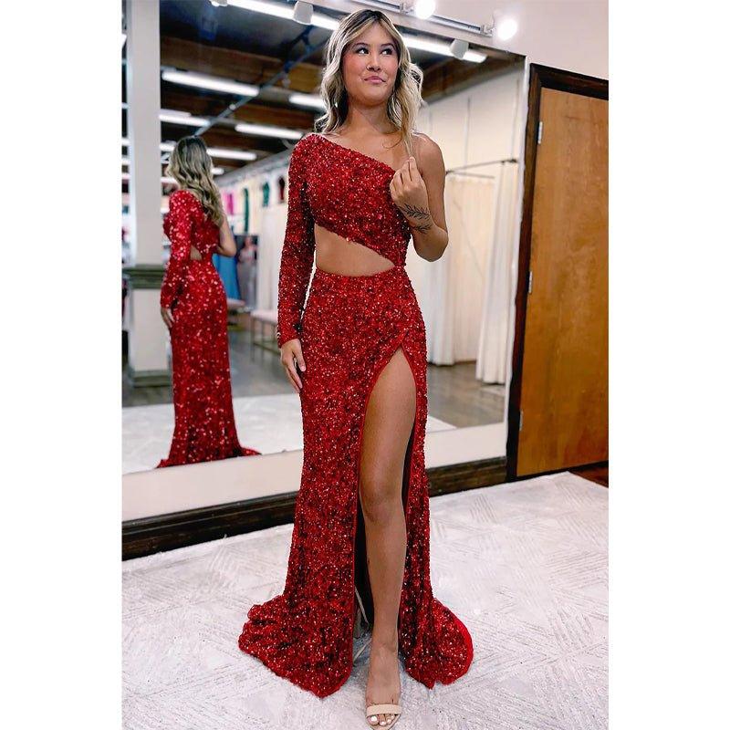Robe de bal chic à une épaule et manches longues en paillettes bordeaux