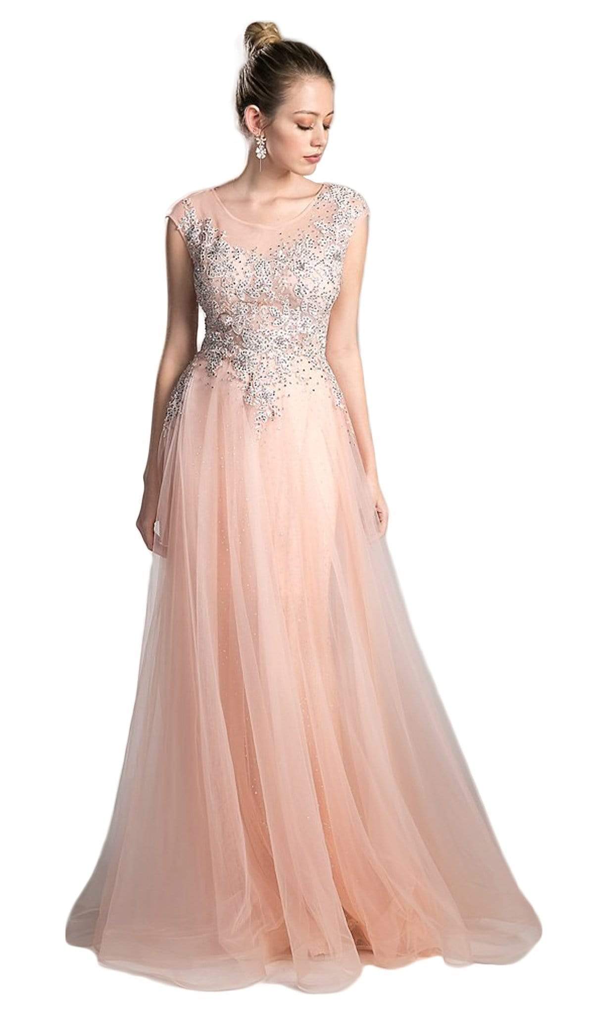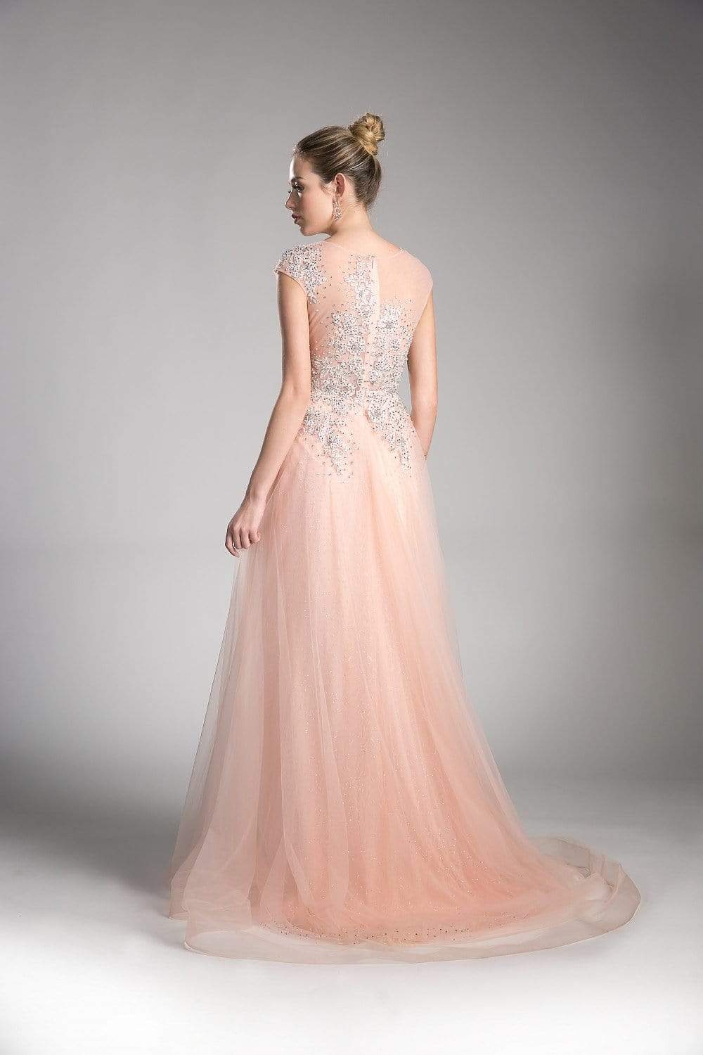 Rayonnez de beauté dans cette robe de soirée Cinderella Divine 8992. Cette pièce d'exception présente un corsage illusion orné de superbes appliques et de perles, se prolongeant jusqu'aux manches courtes et au dos illusion transparent. Confectionnée en tulle, cette robe à la silhouette trapèze se termine par une élégante traîne et sera parfaite pour toutes vos occasions formelles. Attirez tous les regards dans cette ravissante création Cinderella Divine.