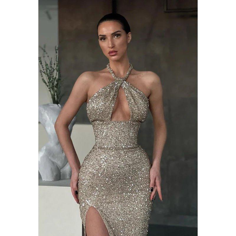 Robe de bal longue fourreau à paillettes et col croisé avec fente sur la cuisse