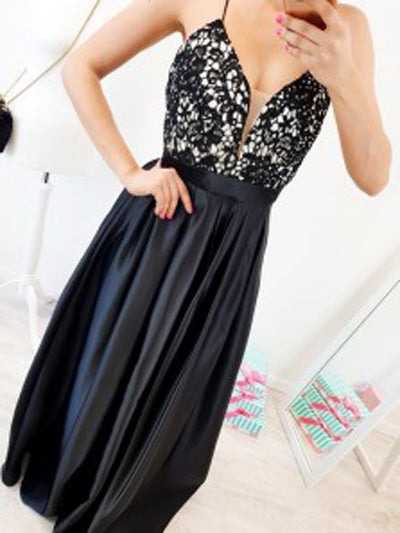 Robe de bal longue noire à fines bretelles et dos croisé, ornée de dentelle, avec décolleté en V. Robes de soirée.