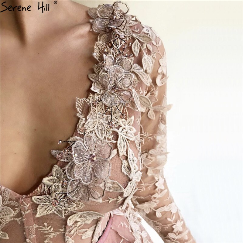 Robe de soirée en tulle rose à manches longues, col en V, motif floral fait main, robe sexy, LA60994, soldes 2025