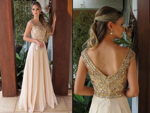 Robe de bal longue élégante en mousseline de soie, coupe trapèze, manches courtes, col rond et perles