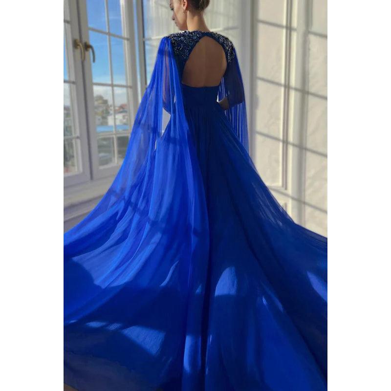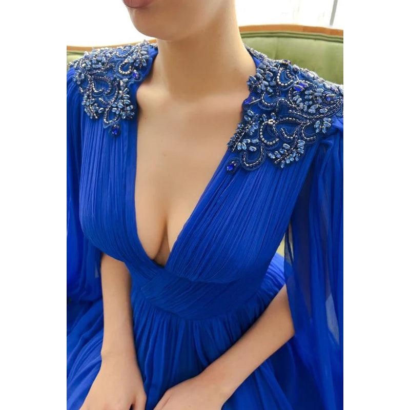 Robe de bal élégante et luxueuse, col en V, coupe trapèze, froncée, fente latérale, avec broderies