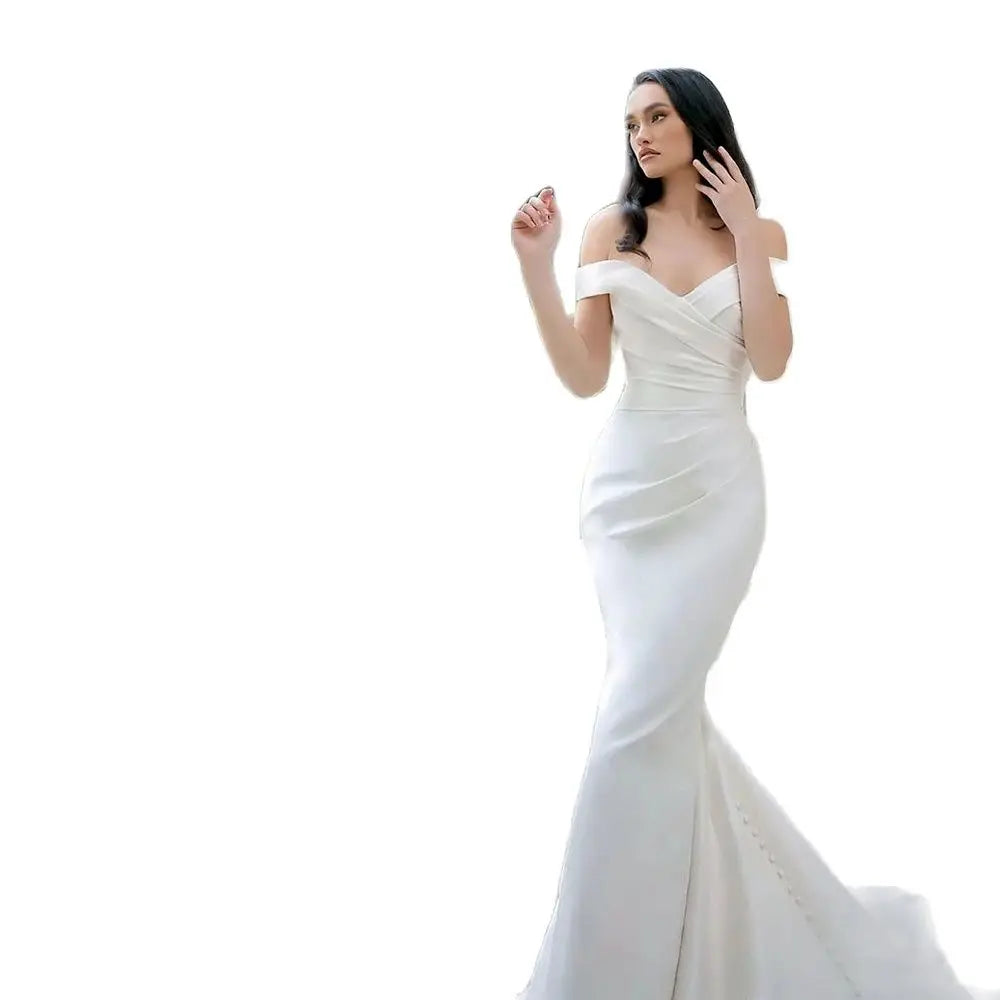 Robe de soirée élégante en satin blanc avec épaules dénudées, plissée, traîne sirène, longueur au sol, pour femme