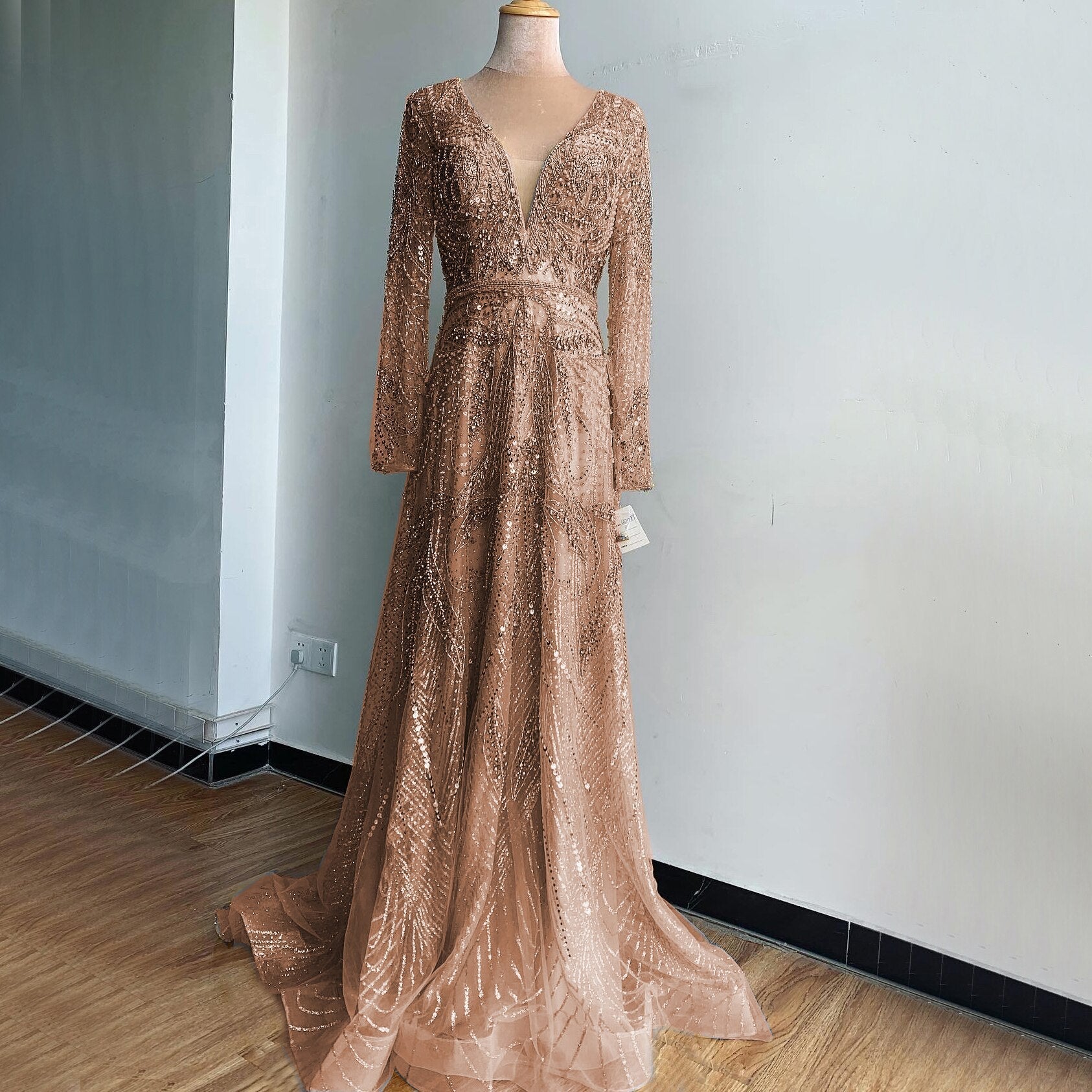 Robe de soirée luxueuse et sexy, col en V, coupe A-line dorée, manches longues, perles et cristaux, en solde, sans retour ni remboursement, 2025, LA70287L
