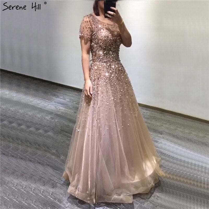 Robe de soirée luxueuse à manches courtes et perles dorées, coupe trapèze, à lacets, pour femme, modèle LA70464, 2025