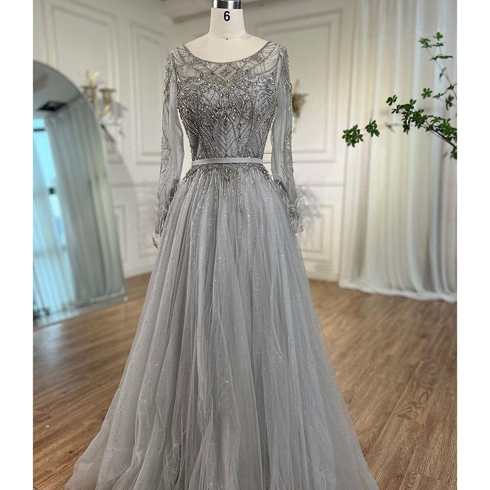 Robe de soirée grise trapèze à perles et plumes, manches longues, luxueuse robe de soirée, Dubaï, LA70472, 2025