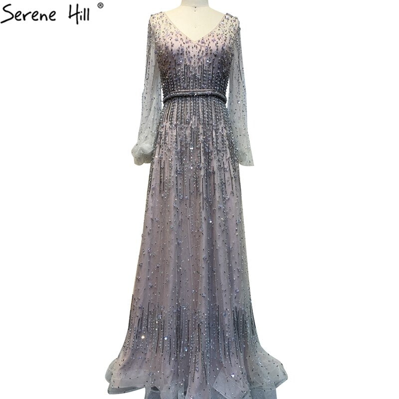 Robe de soirée luxueuse grise à paillettes, coupe trapèze, manches longues, perles, style Dubaï, LA70642