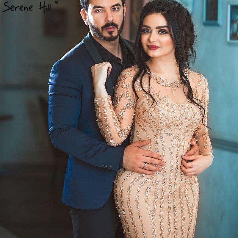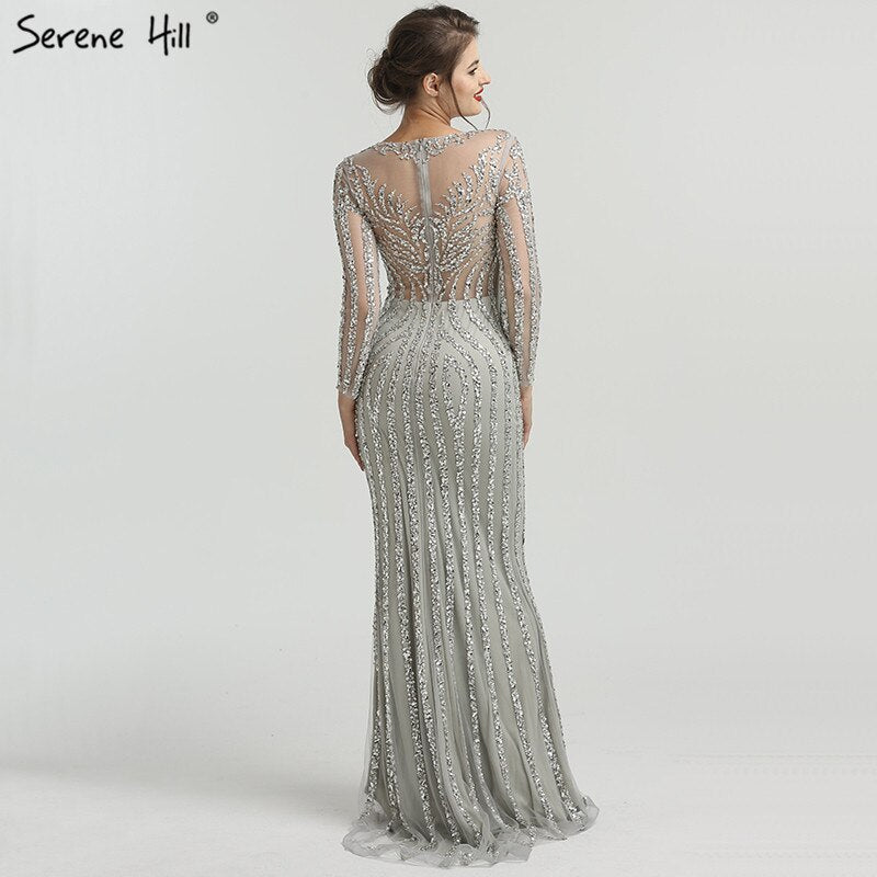 Robe de soirée sirène grise luxueuse à manches longues et paillettes, tenue de soirée sexy ornée de diamants et de perles, photo réelle LA6591, 2025