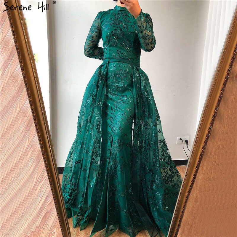 Robe de soirée musulmane de luxe verte à manches longues, style sirène scintillante, col haut, modèle LA60755, 2025