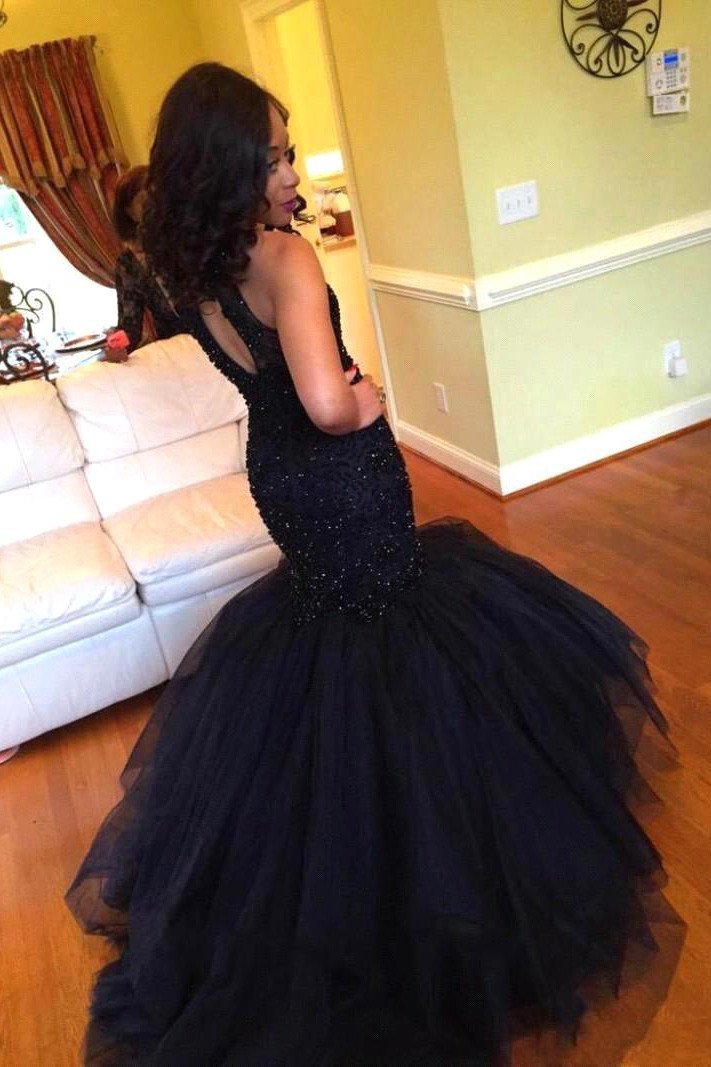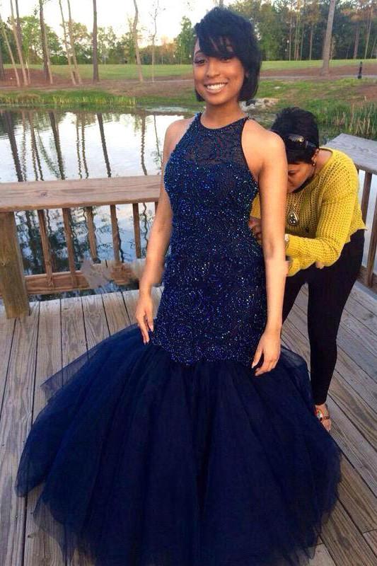 Robe de bal longue sirène sans manches en tulle bleu marine, dos nu, ornée de perles