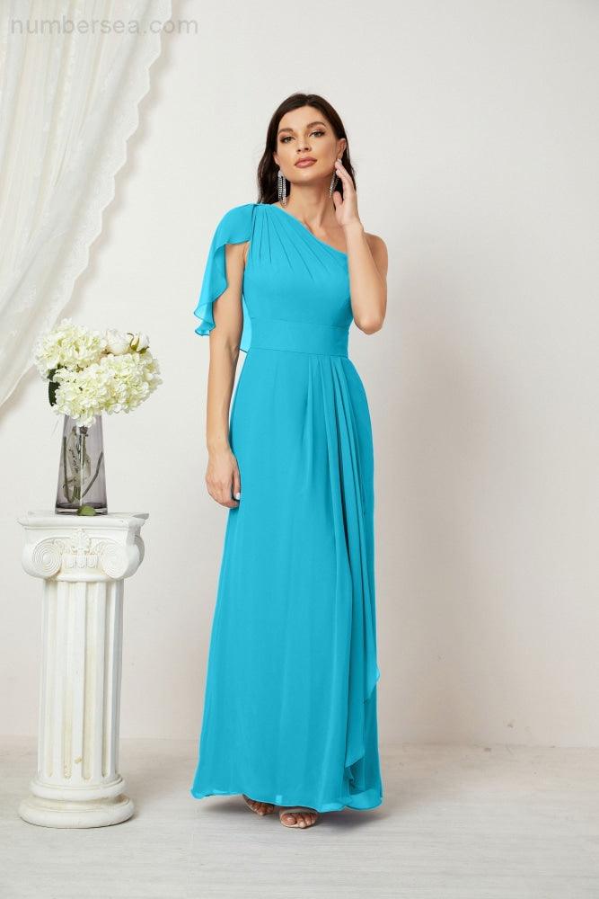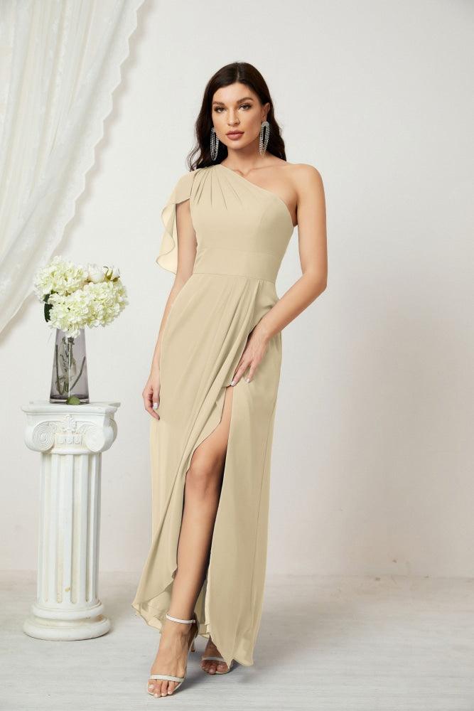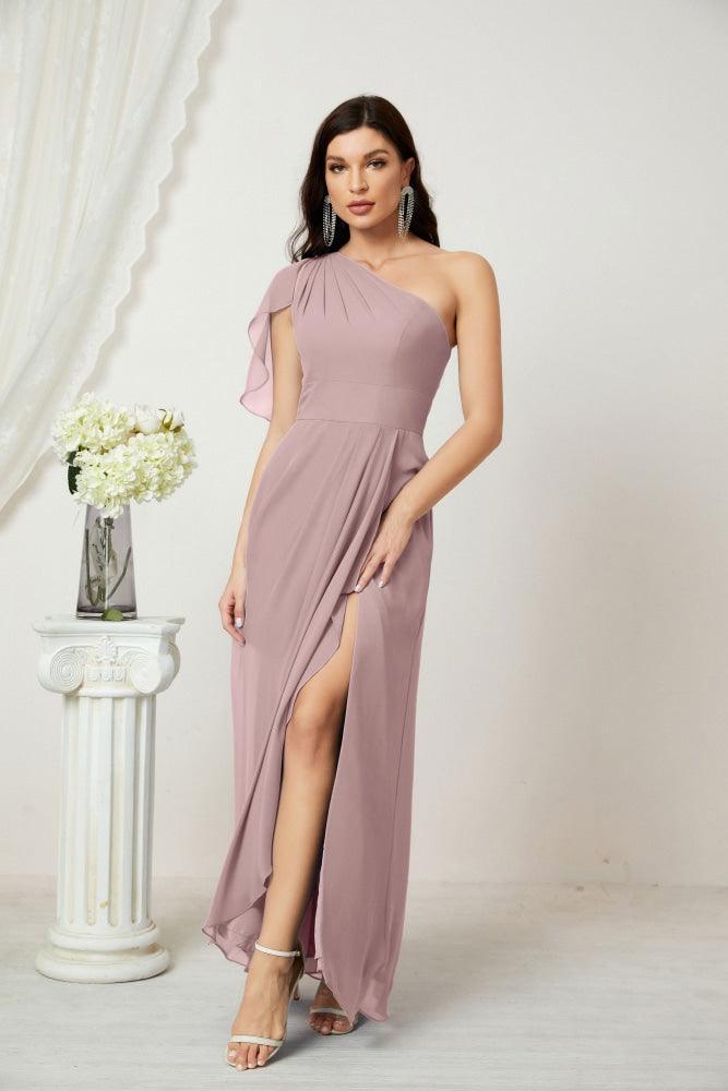 Robe de demoiselle d'honneur longue en mousseline de soie à volants et à une épaule, coupe trapèze, robe de soirée formelle fendue sur le côté, 2809