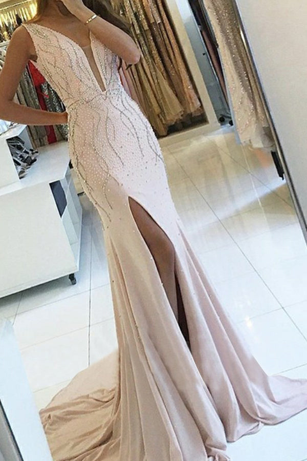 Robe de bal longue rose sirène dos nu à col en V ornée de perles.MP558