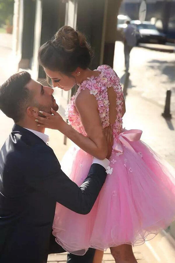 Robe de bal courte en tulle rose ornée de fleurs faites main. Robe de retour à la maison.