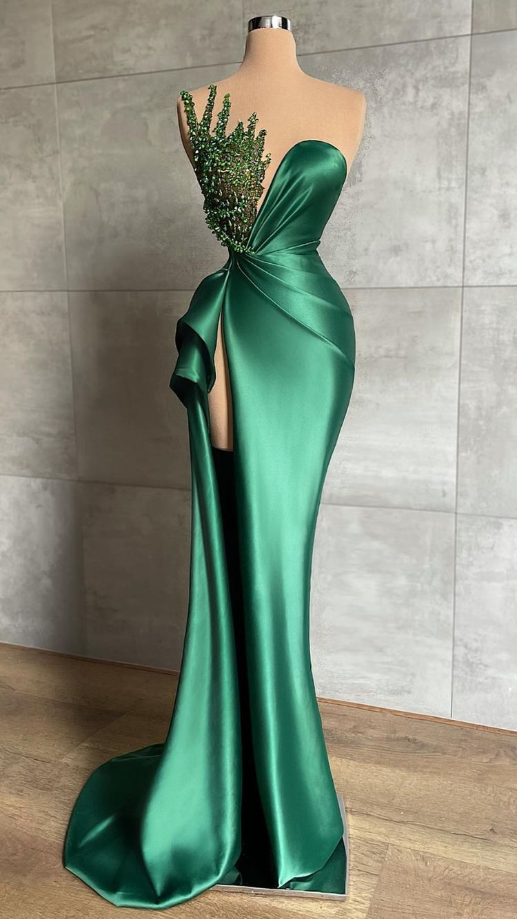 Robe de soirée longue vert émeraude à décolleté plongeant en V et perles, fendue jusqu'à la cuisse (Y596)