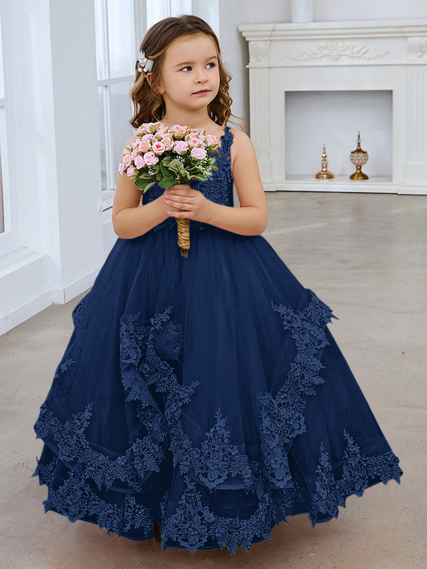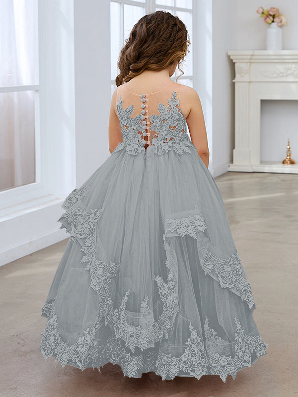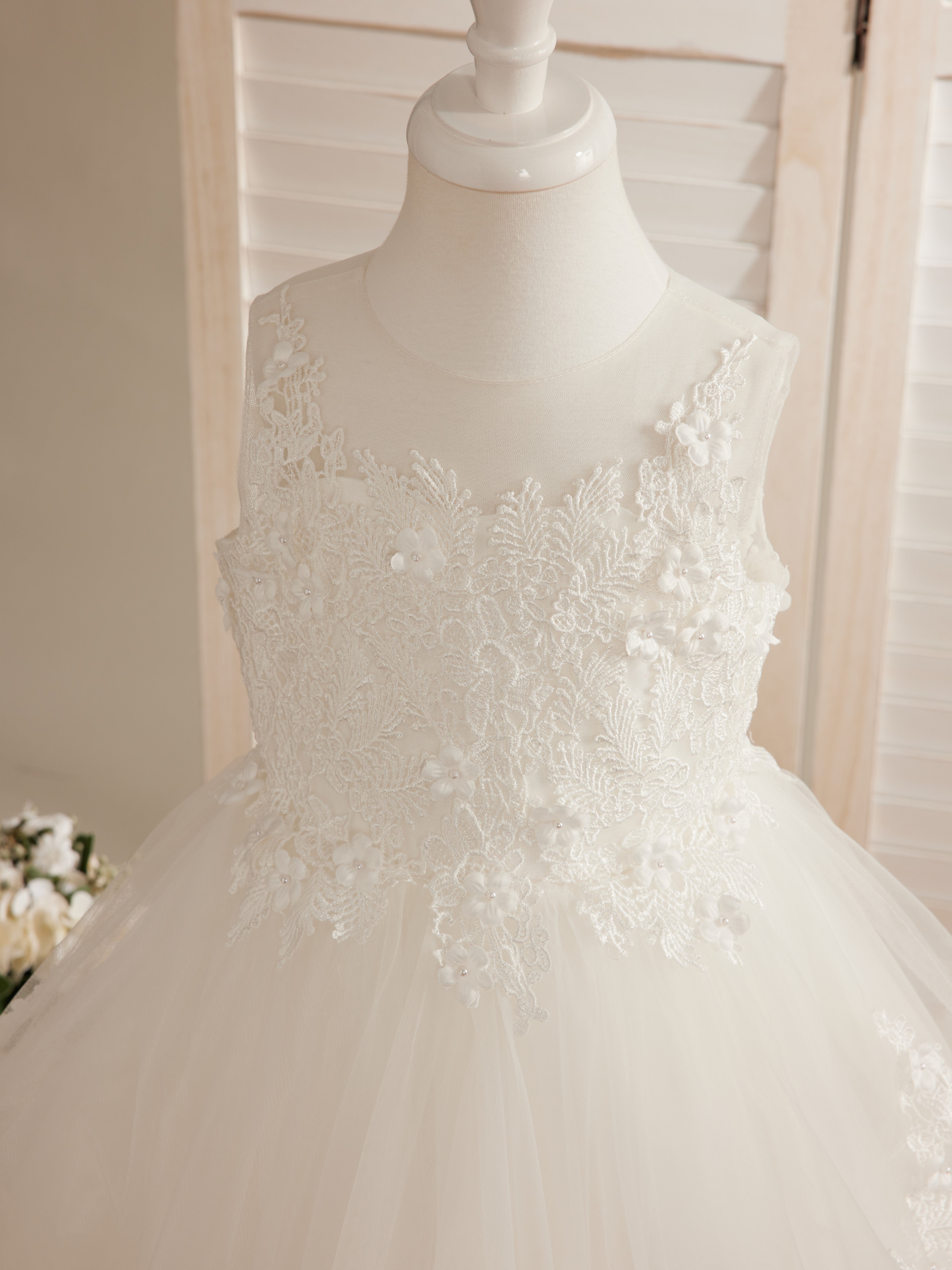 Robe de princesse sans manches en tulle avec applications de dentelle et traîne pour filles