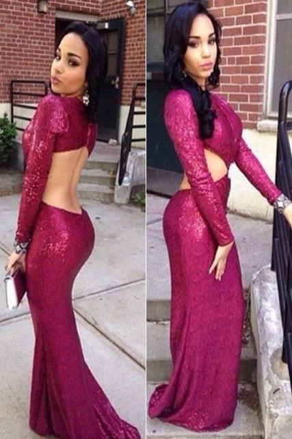 Robe de bal sirène violette dos nu à paillettes et manches longues, robe de soirée