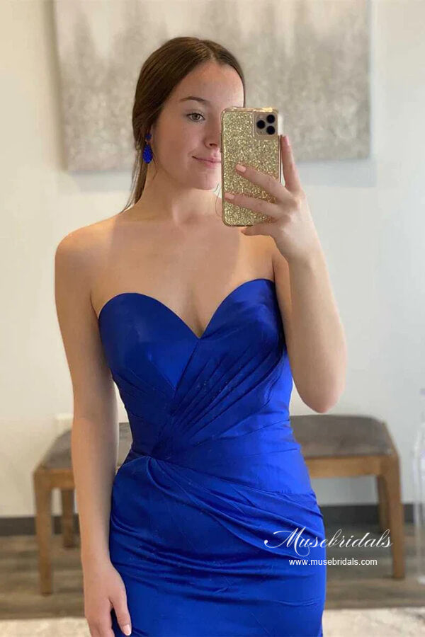 Robe de bal longue en satin bleu roi, coupe fourreau, bustier cœur à volants. MP897