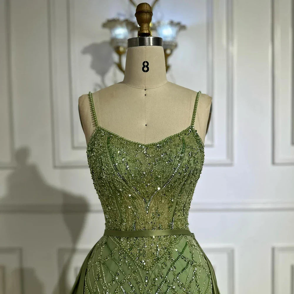 Robe de soirée de luxe vert sauge ornée de perles et d'une surjupe LA72733A