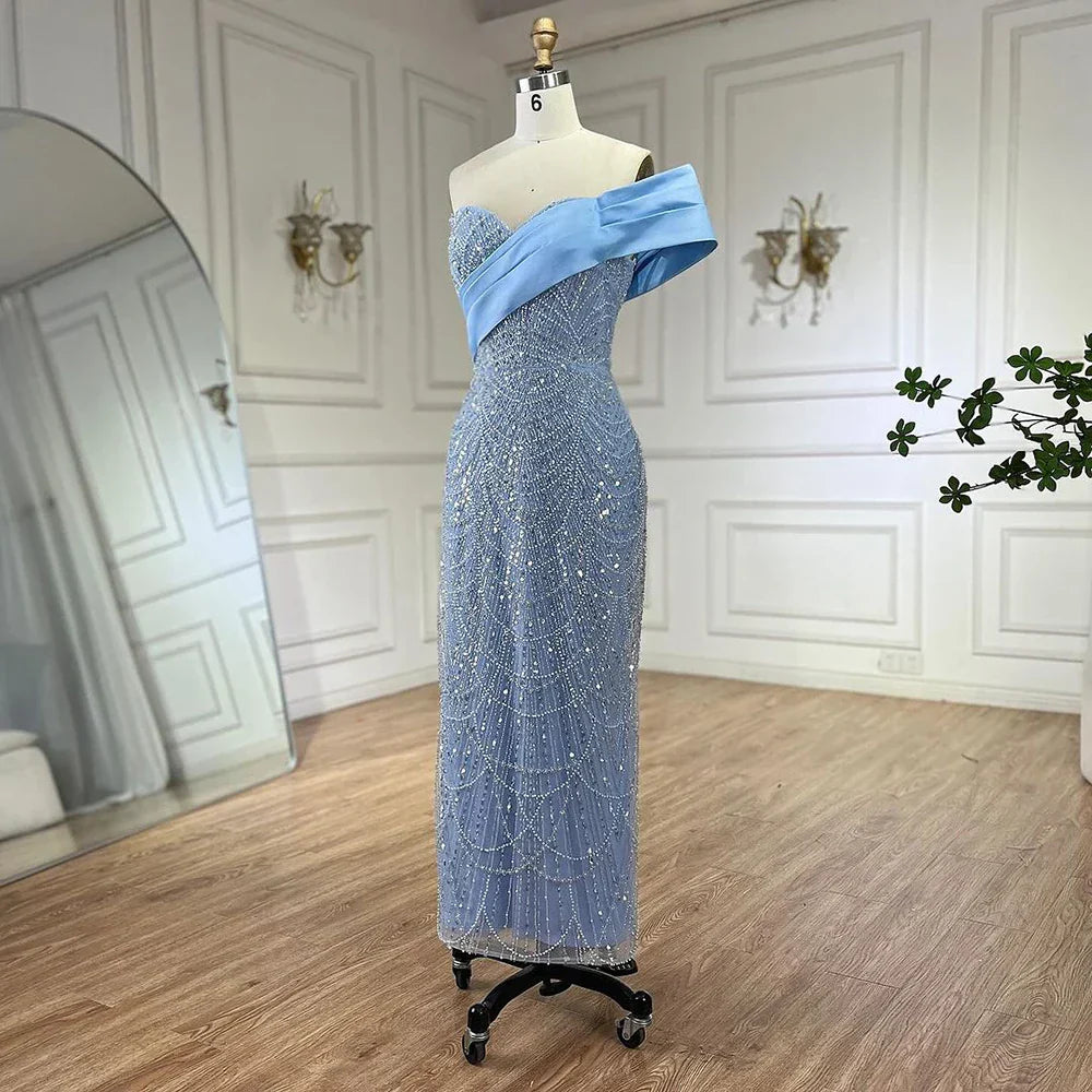 Robe de soirée sirène asymétrique bleu arabe 2025, luxueuse robe de soirée avec perles, pour femme, LA72370