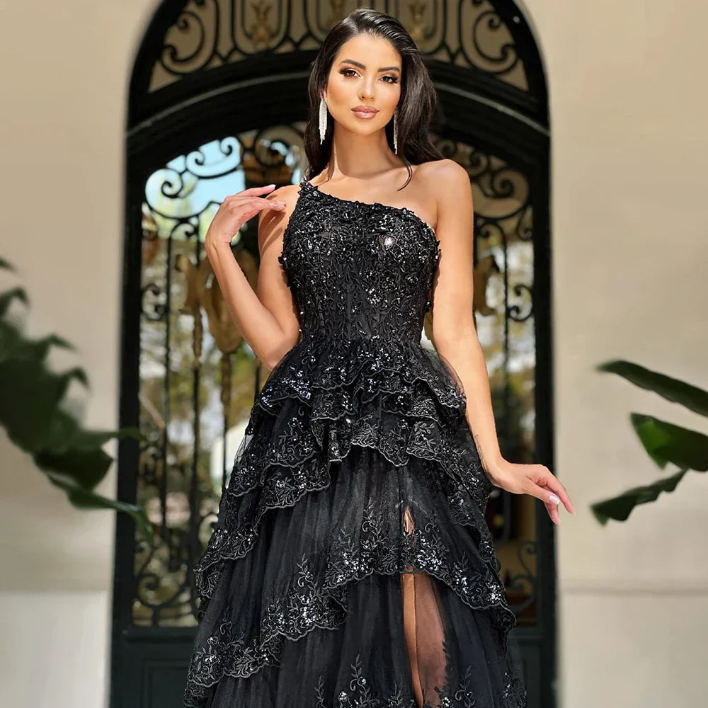 Robe de bal élégante noire style arabe, asymétrique, fendue sur le côté, en dentelle, luxueuse, pour femme, LA72647, 2025
