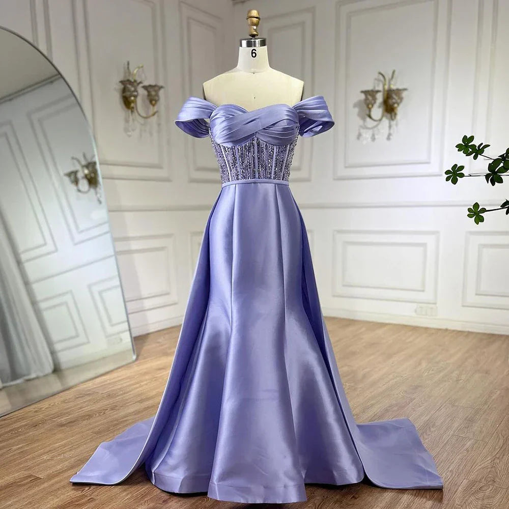 Robe de soirée longue en satin lilas arabe 2025 avec surjupe – Élégante robe de soirée perlée pour mariage LA72359