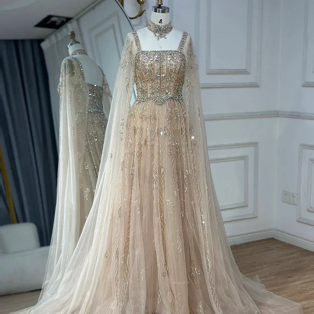 Robe de soirée de luxe arabe couleur chair, coupe trapèze, manches cape, perles de cristal, style saoudien, pour occasions formelles, LA72764, 2025