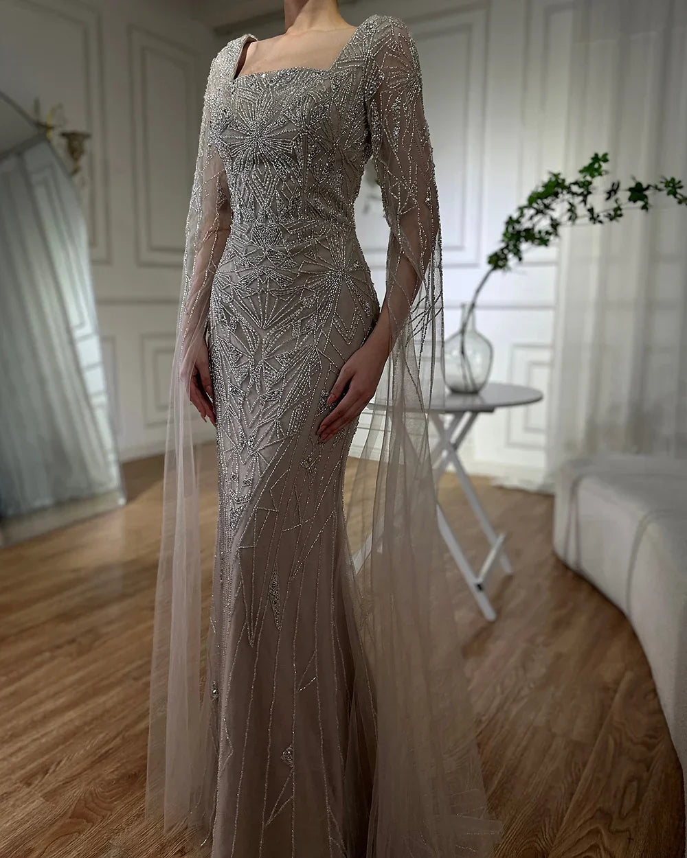 Robe de soirée sirène à manches cape, style arabe, style saoudien, luxueuse, perlée, pour occasions formelles, LA72261B, 2025