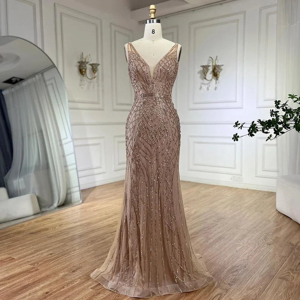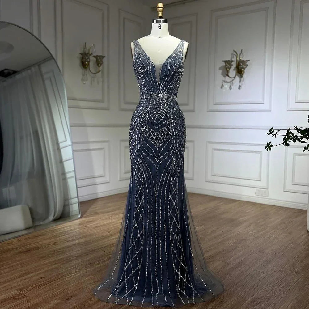 Robe de soirée sirène bleue élégante à bretelles spaghetti et perles, luxueuse, pour femme, tenue de mariage, LA72450, 2025