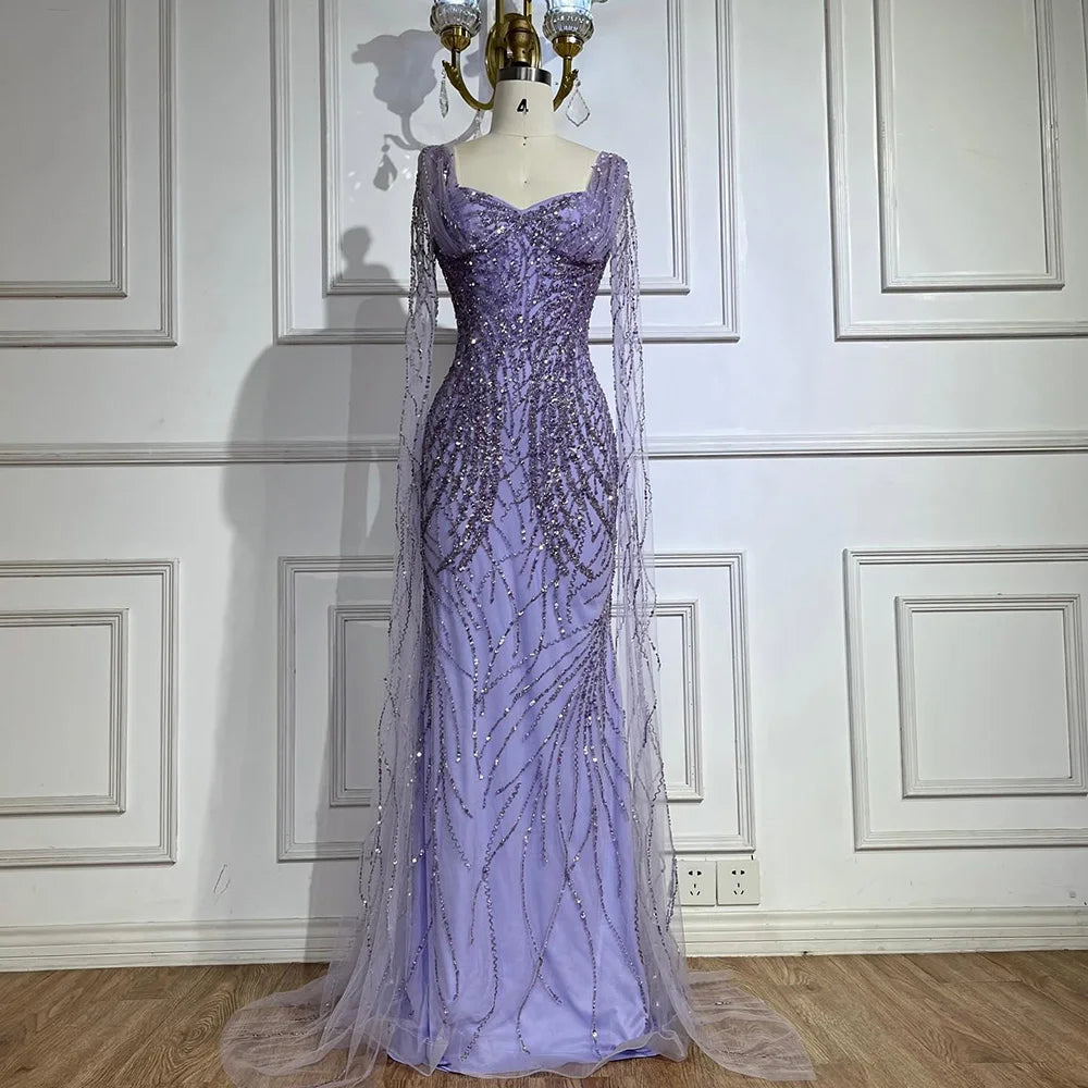 Avec ses manches cape raffinées et son élégante silhouette sirène, cette robe vous fera sentir royale. Parfaite pour les événements officiels, les mariages et les fêtes. Confectionnée à la main avec précision et souci du détail, elle est une véritable merveille.