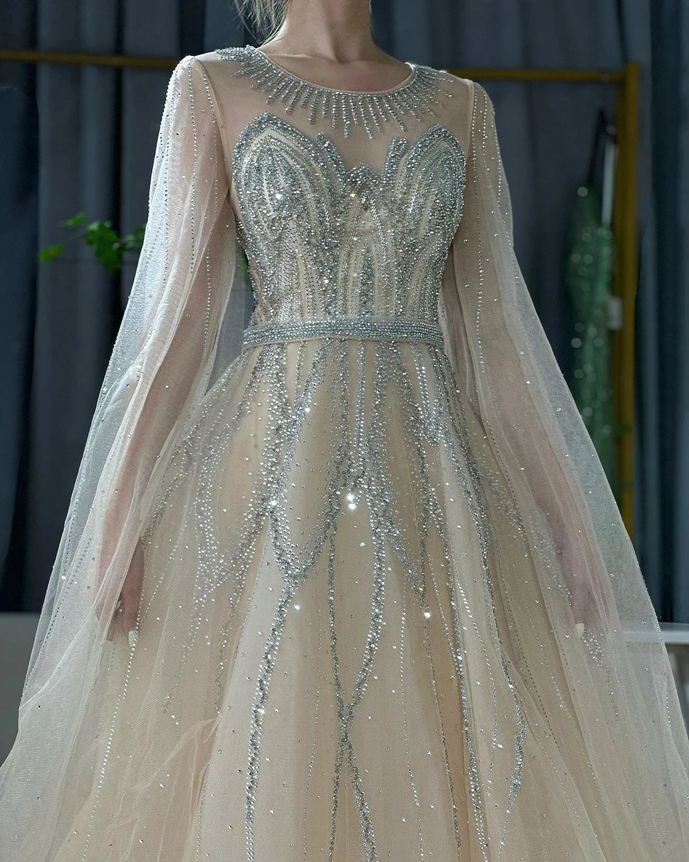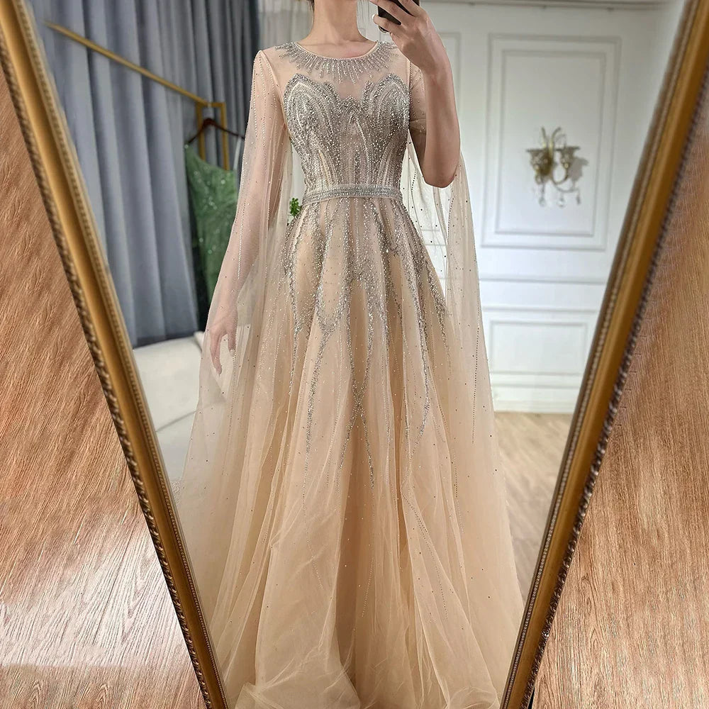Robe de soirée longue arabe élégante bleu nude, coupe trapèze, perlée, avec manches cape, pour une occasion formelle, LA72785, 2025