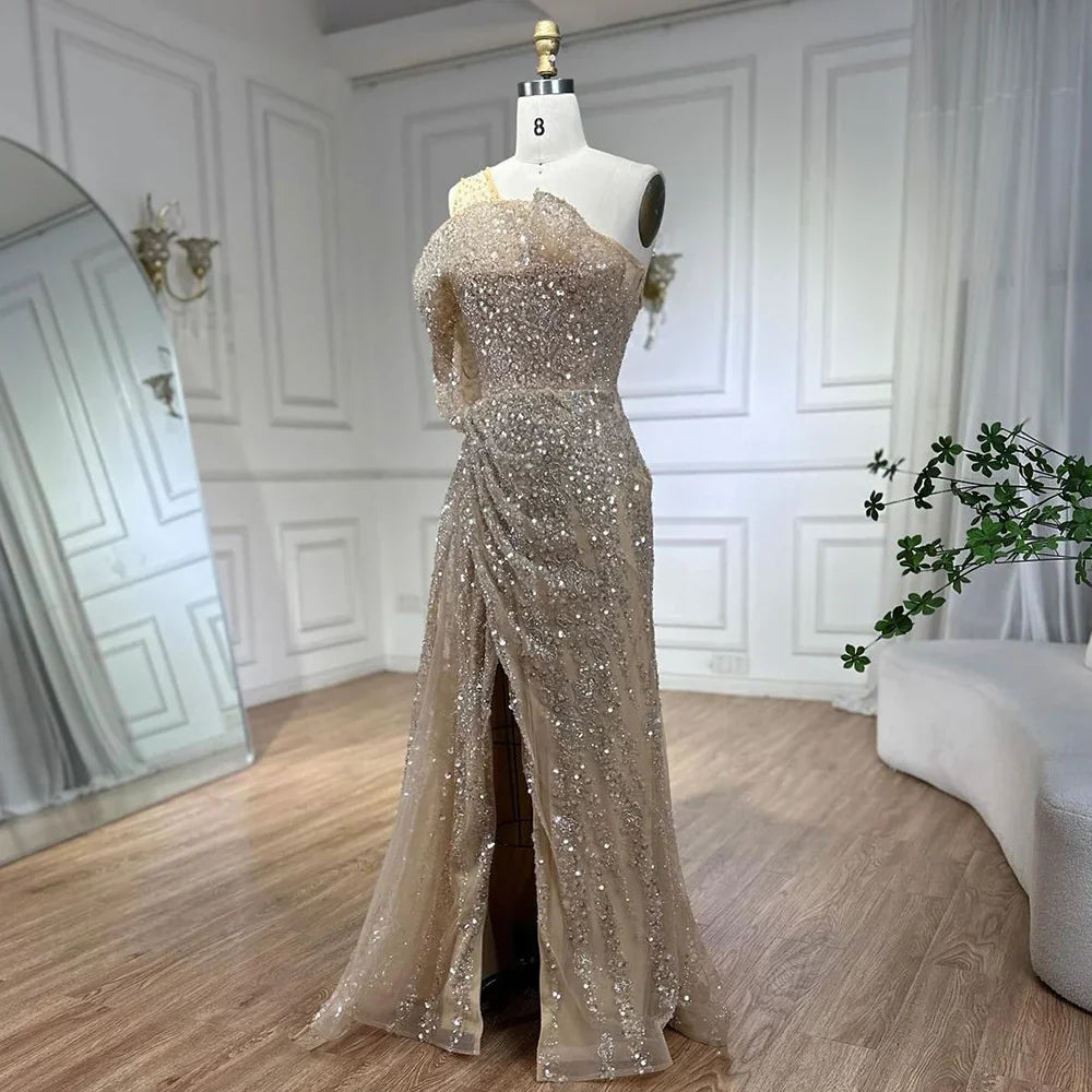 Robe de soirée sirène de luxe à une épaule, fendue et perlée, couleur chair, style Dubaï, pour femmes, tenue de mariage, LA72385, 2025