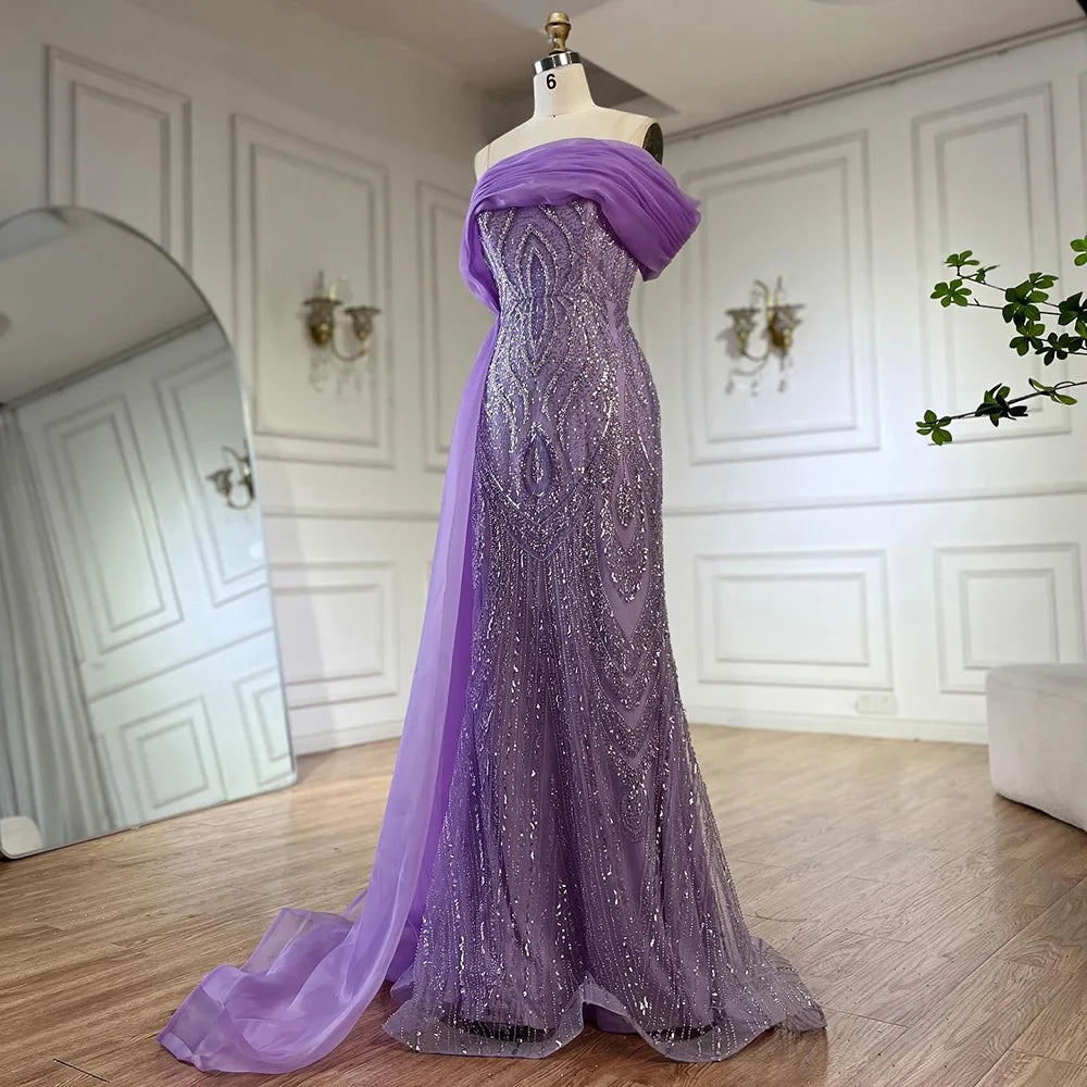 Robe de soirée sirène violette asymétrique, avec jupe latérale superposée et perles, pour une occasion formelle, modèle Saudi LA72706, 2025
