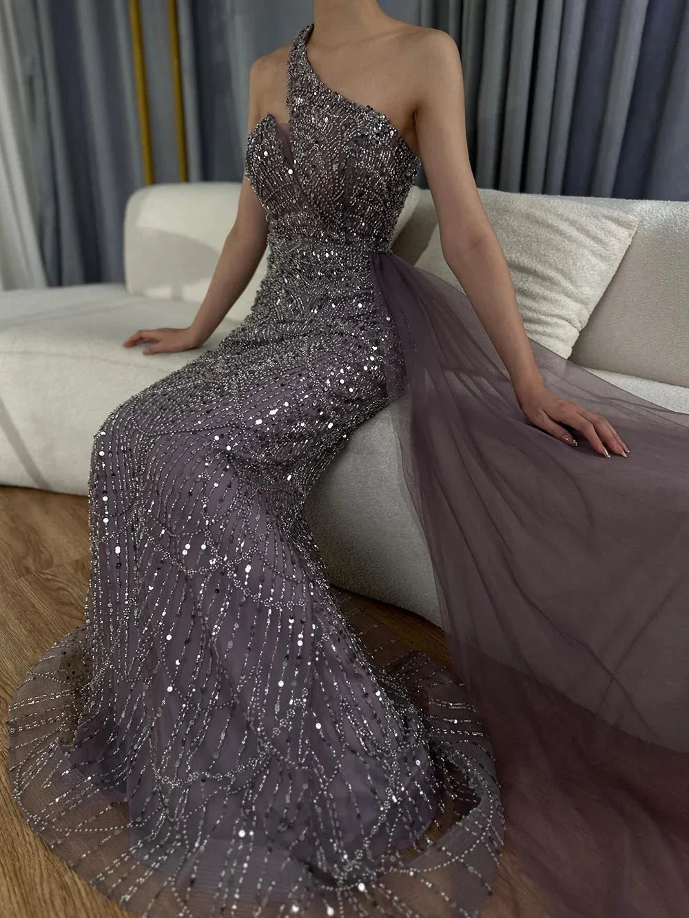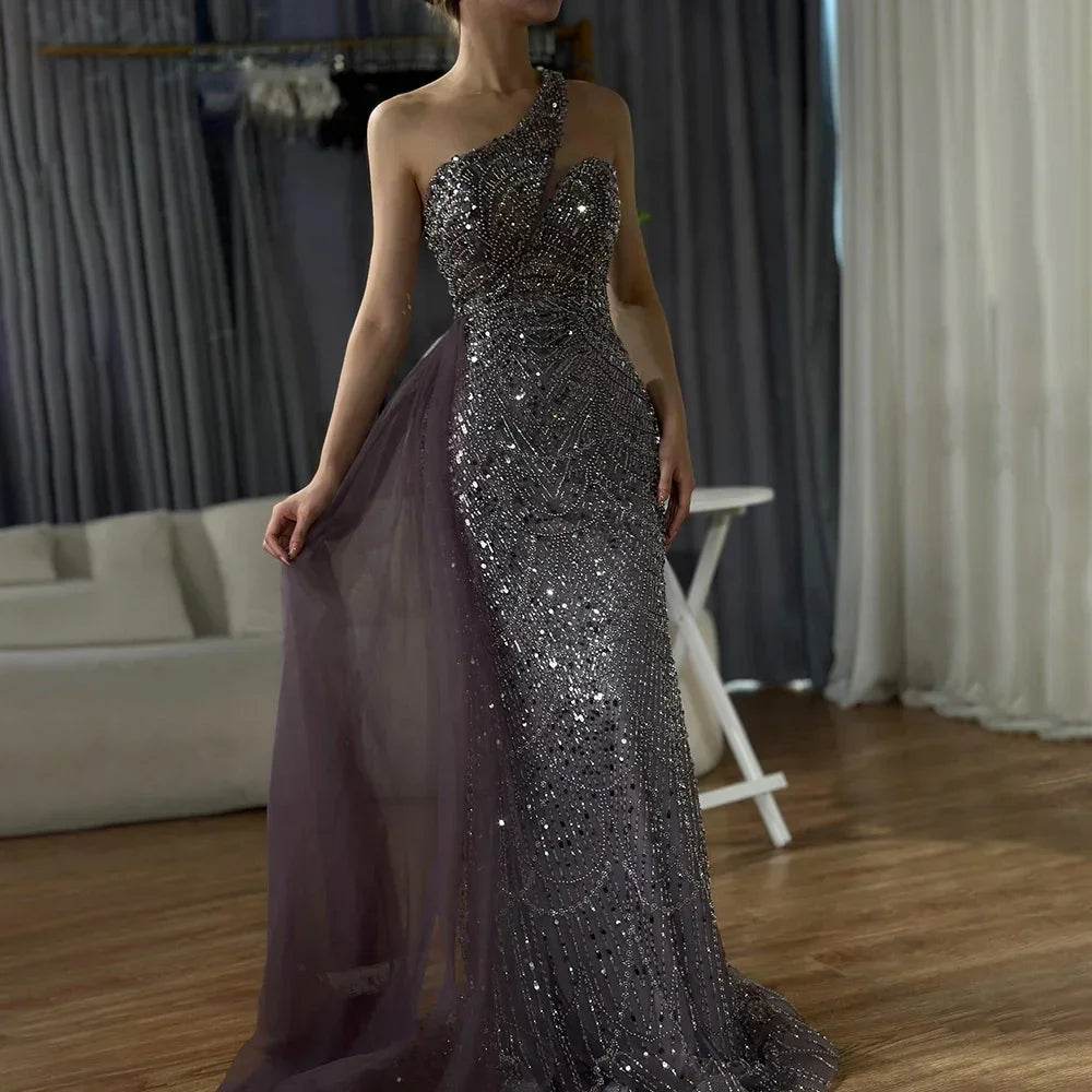 Robe de soirée saoudienne violette asymétrique, avec jupe latérale perlée, pour une occasion formelle, LA72735, 2025