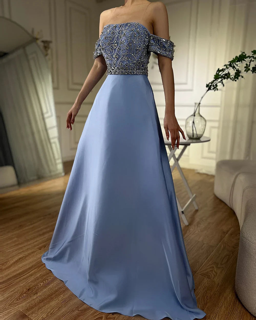 Robe de soirée longue bleue élégante, style saoudien, épaules dénudées, coupe trapèze, ornée de perles, pour une occasion formelle, LA72753, 2025