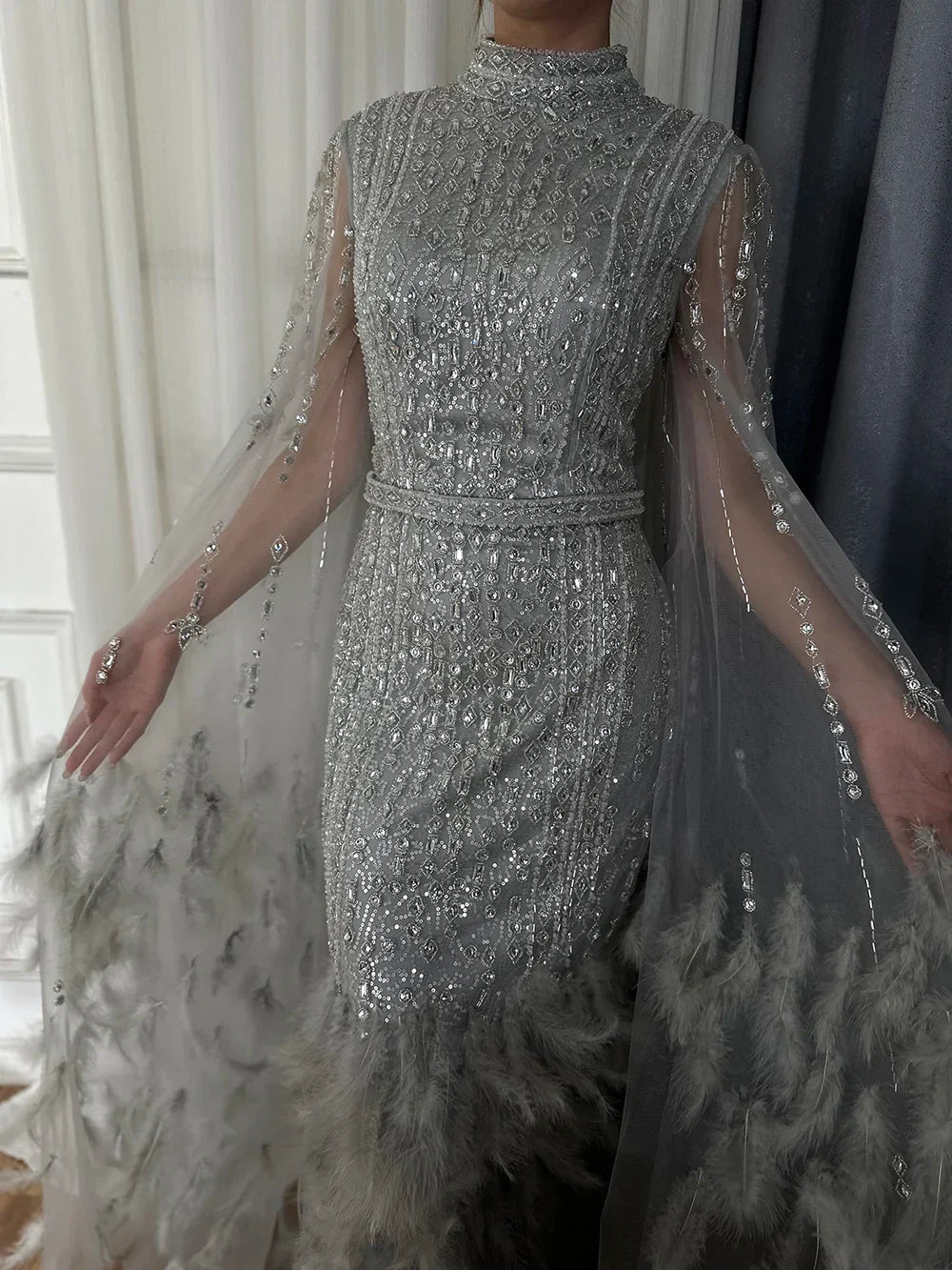 Robe de soirée sirène gris argenté 2025, manches cape, plumes, perles, longueur cheville, pour une occasion formelle, LA72747