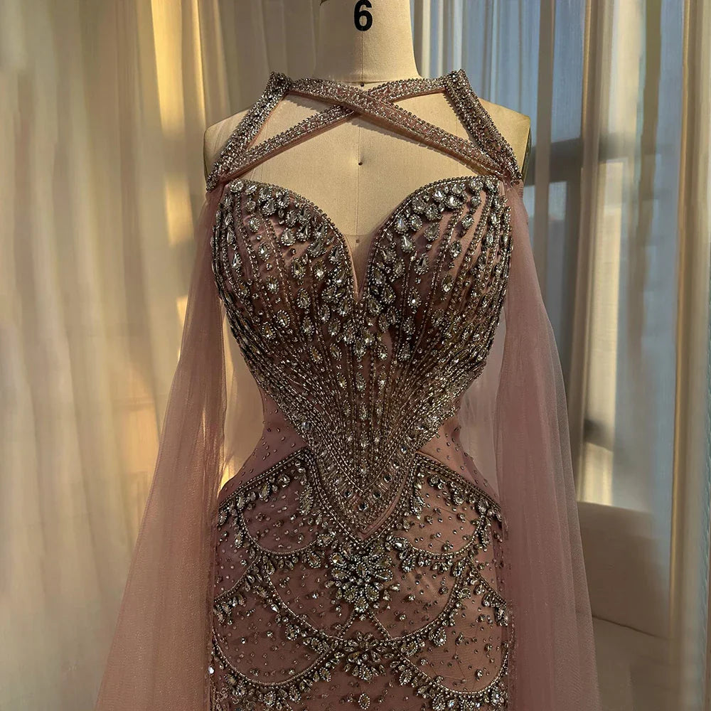 Robe de soirée arabe couleur chair, manches cape, perles et cristaux, pour femme, tenue de mariage, LA72806, 2025