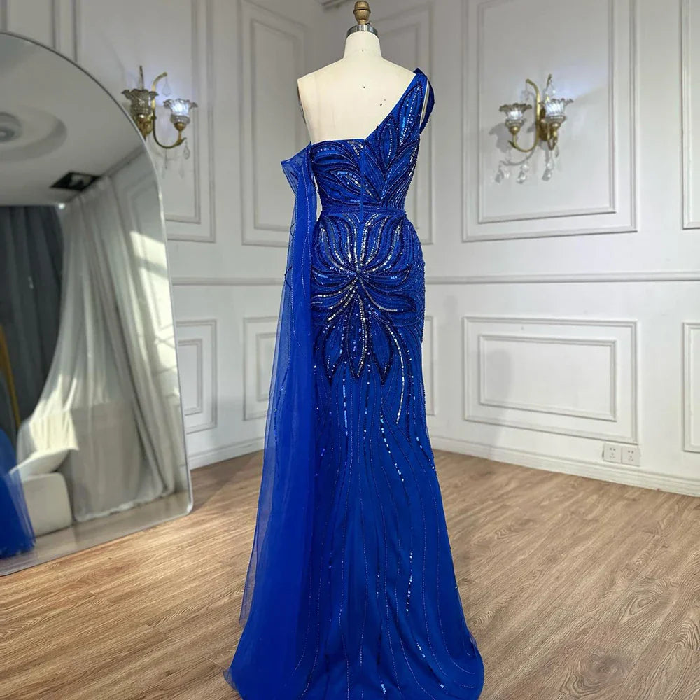 Robe de soirée sirène bleu roi asymétrique à perles et fente pour une occasion formelle, LA72869, 2025
