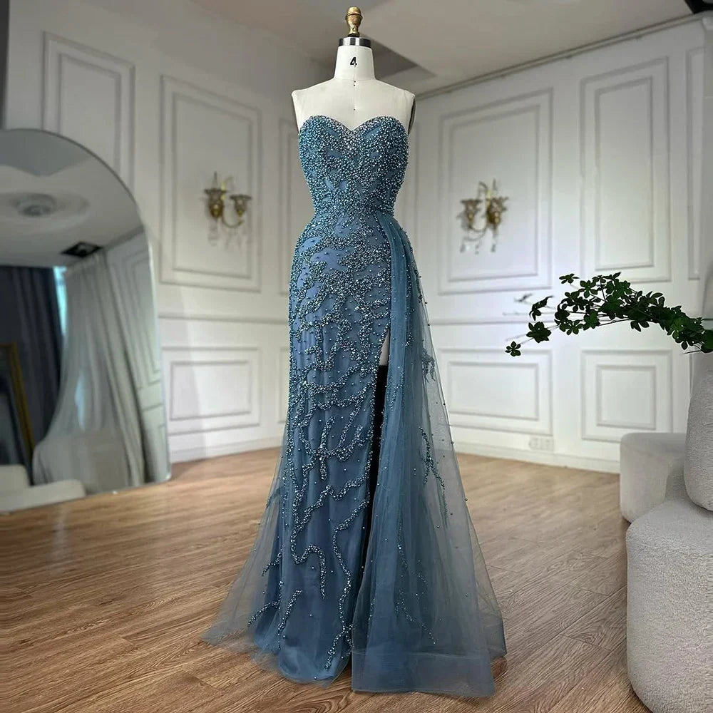 Robe de soirée élégante de style arabe saoudien 2025, robe bleue perlée avec fente, pour une occasion formelle, LA72877