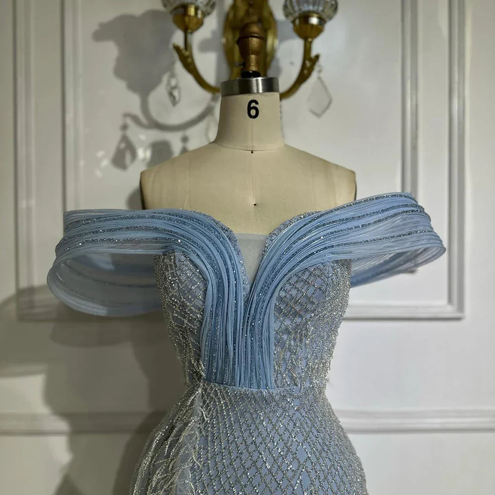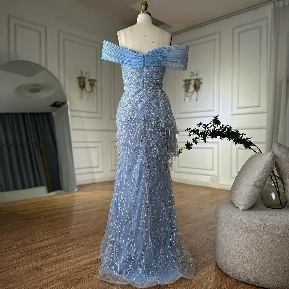Robe de soirée sirène bleu saoudien 2025, épaules dénudées, avec perles et fente latérale, pour une occasion formelle, LA72867