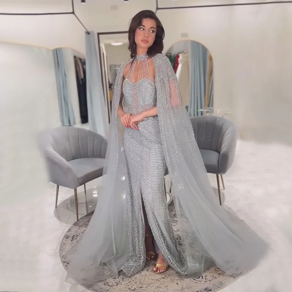 Robe de soirée sirène grise élégante à manches cape, luxueuse et perlée, pour femme, tenue de mariage, 2025, LA72247