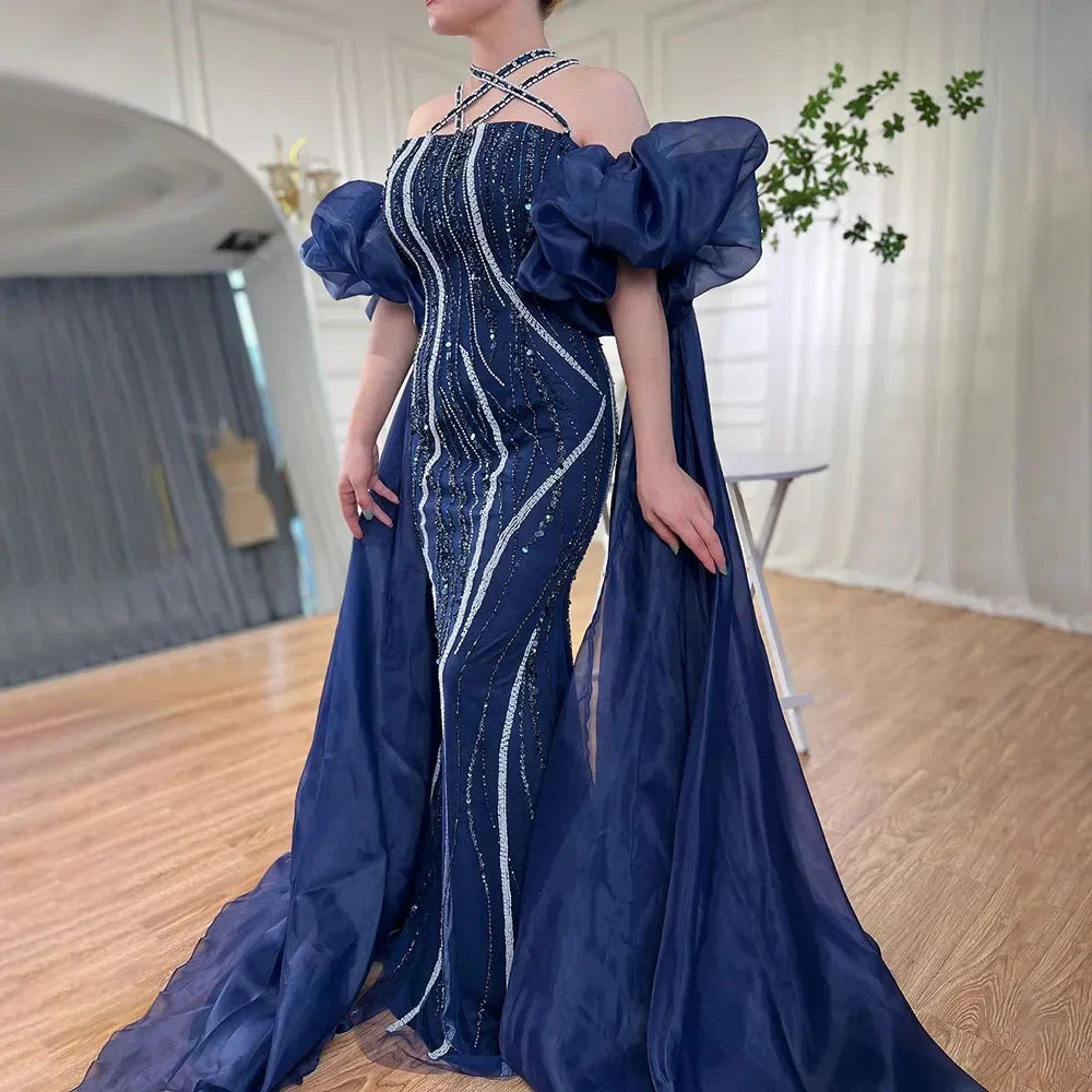 Robe de soirée élégante style sirène bleu marine, manches ballon, perles, luxueuse, Dubaï, pour femme, LA72072