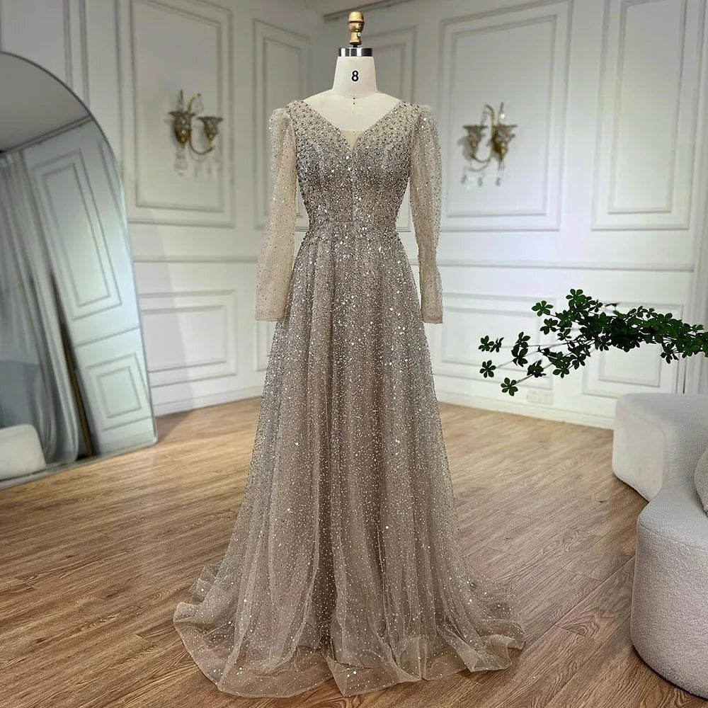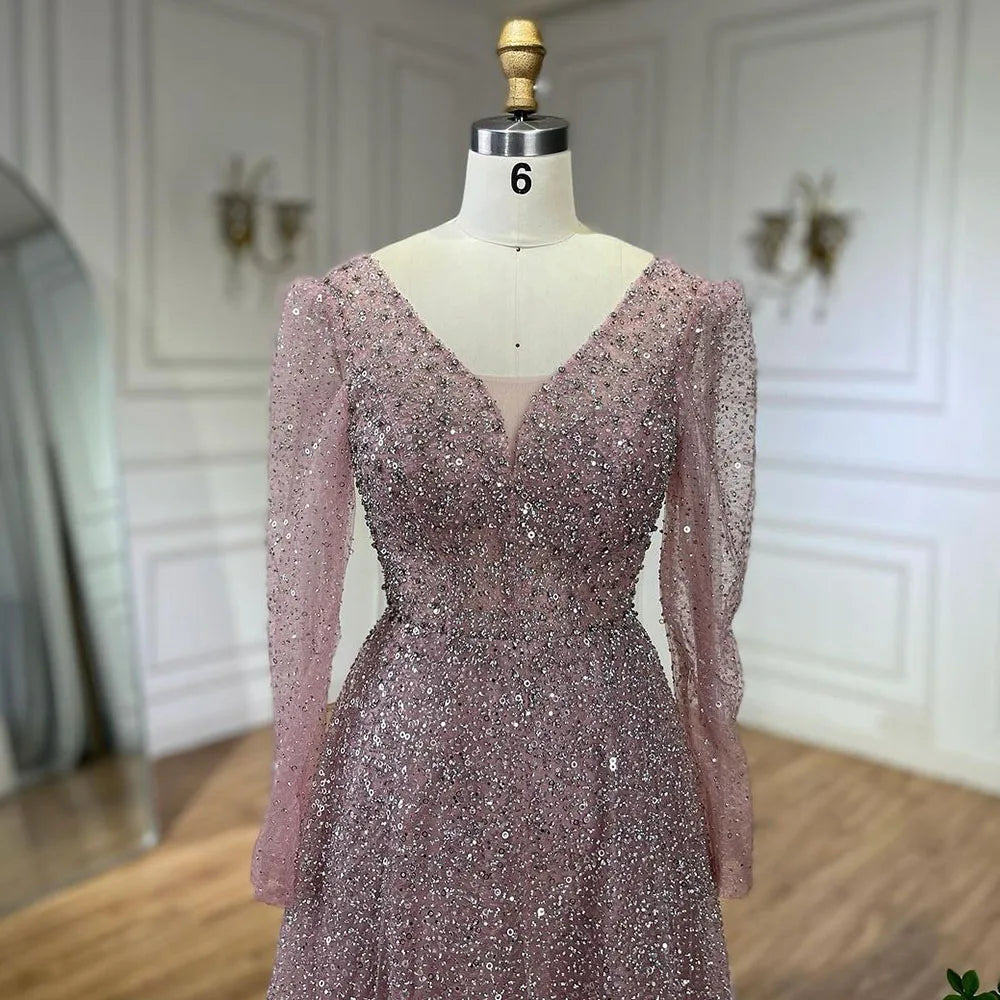 Robe de soirée élégante rose style arabe, coupe trapèze, manches longues, luxueuse, ornée de perles, pour femme, tenue de mariage, 2025, LA72521