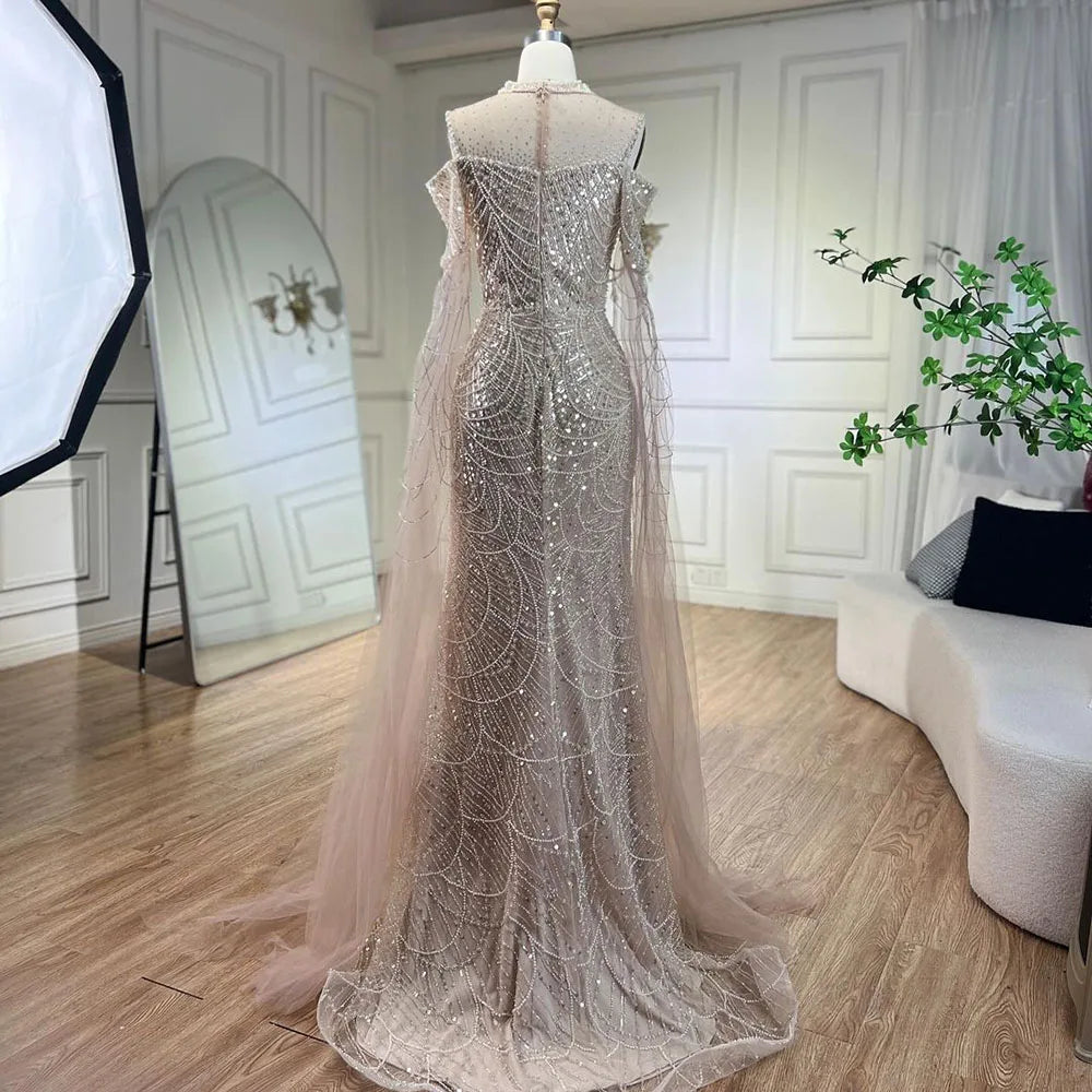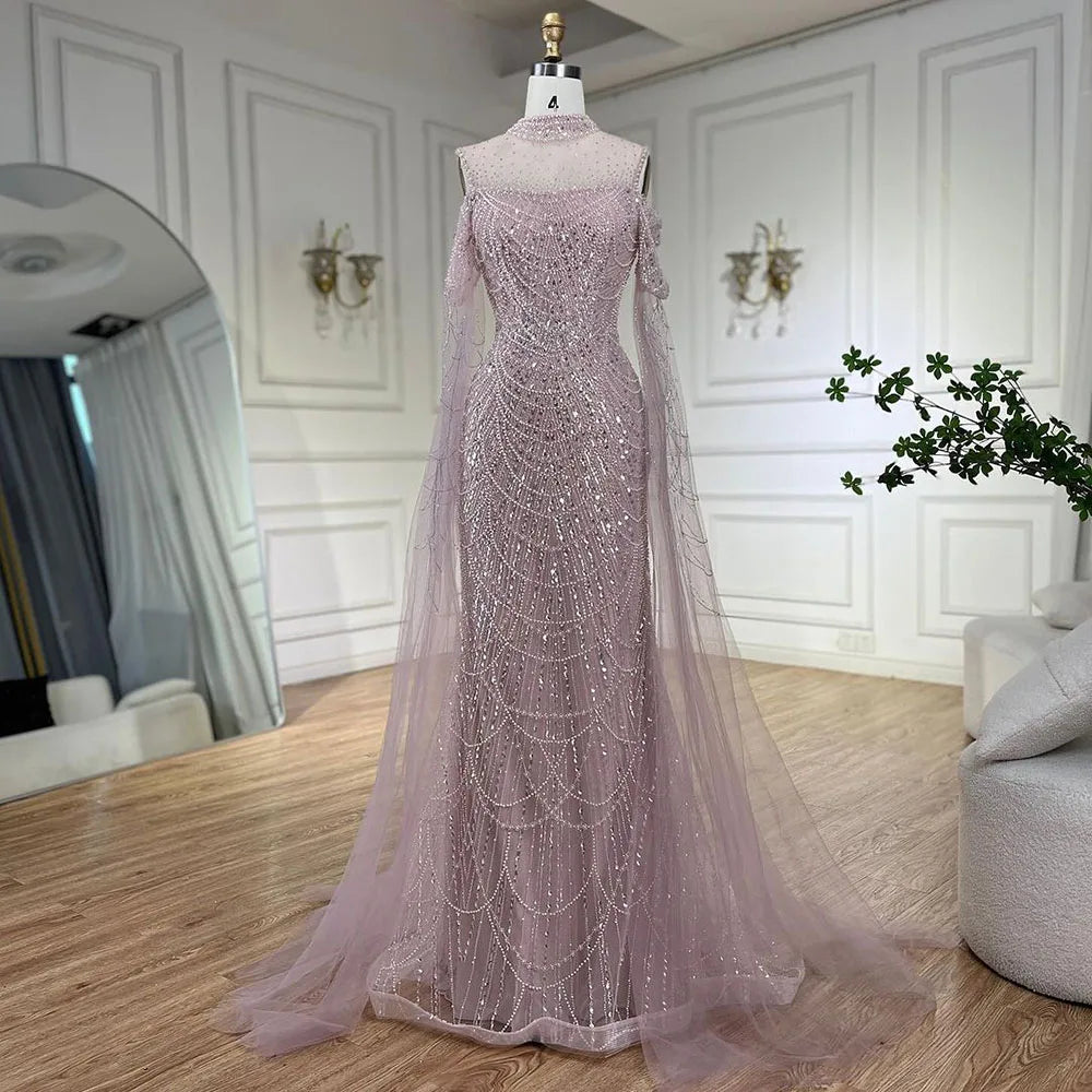 Robe de soirée longue de luxe style sirène, manches cape, perles, style arabe violet, pour femme, tenue de mariage, LA71992, 2025