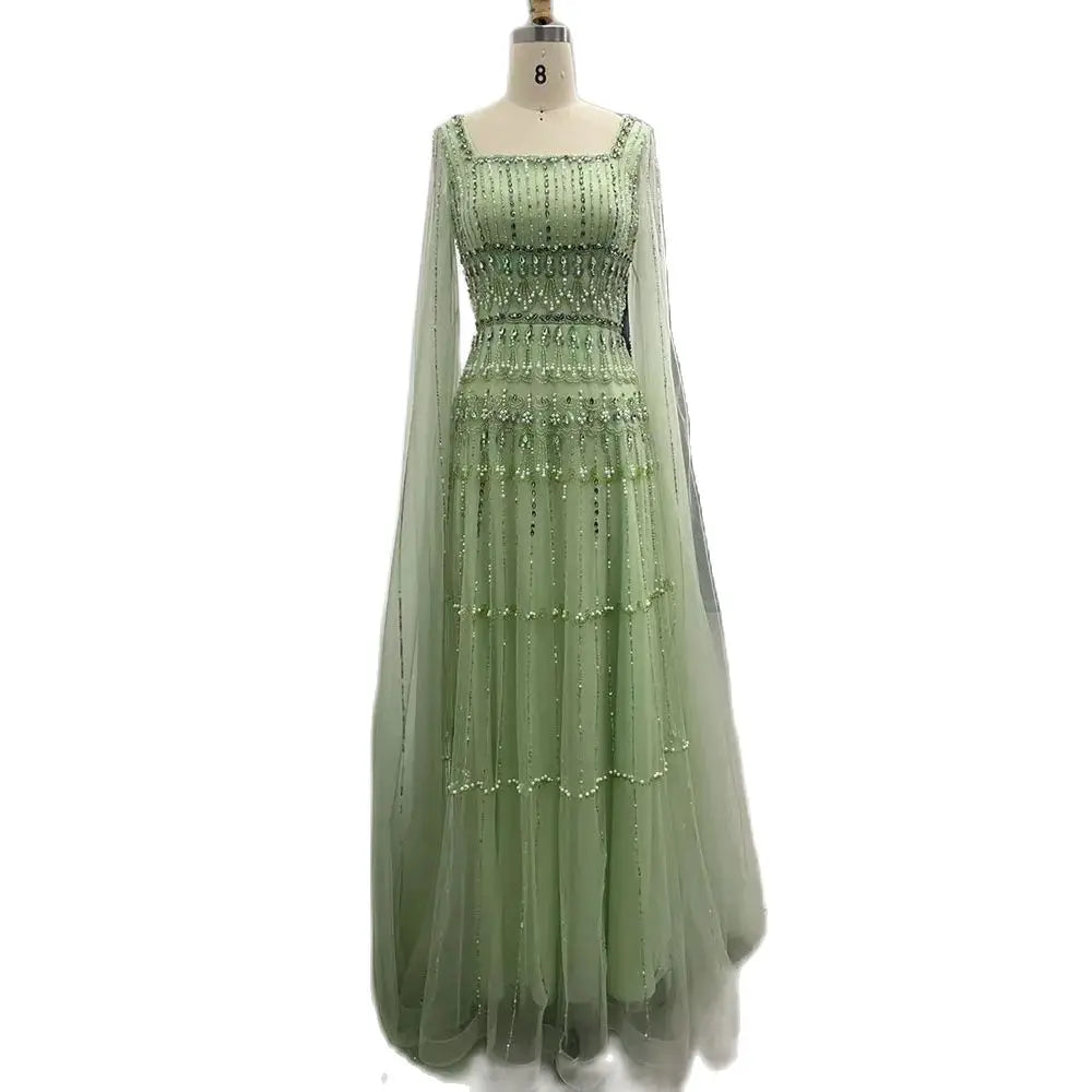 Robe de soirée longue de luxe à perles, coupe trapèze, vert sauge, style arabe, avec manches cape, pour femme - Party 2025 LA72595