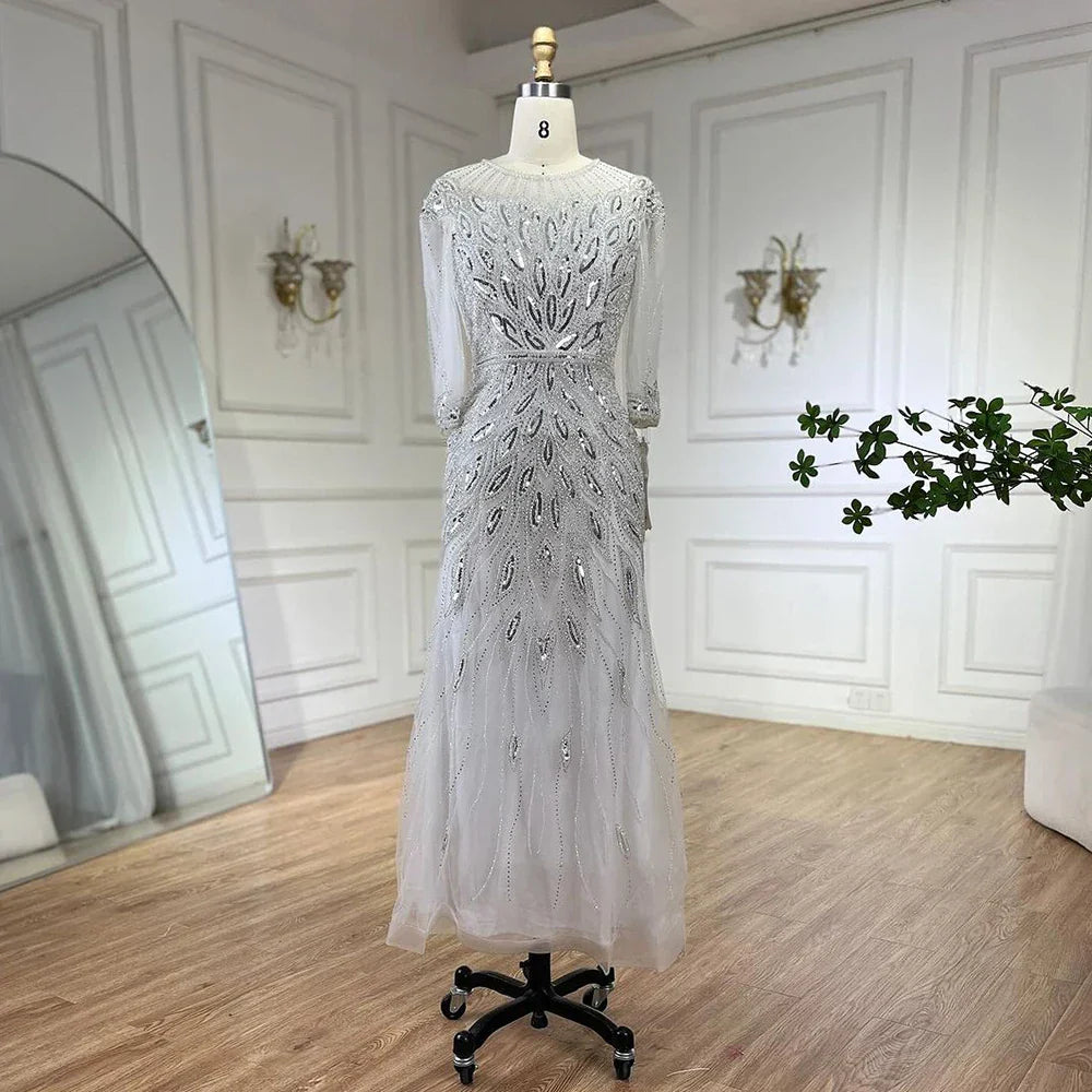 Robe de soirée de luxe arabe argentée et blanche, avec perles, longueur cheville, pour femme, tenue de mariage, modèle LA71999S, 2025