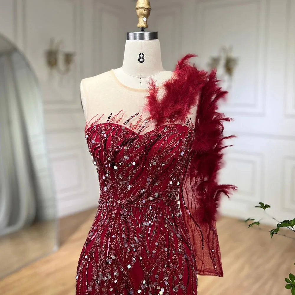 Robe de soirée sirène rouge vin arabe, luxueuse, plumes, perles, élégante, pour femme, fête de mariage, 2025, LA71076
