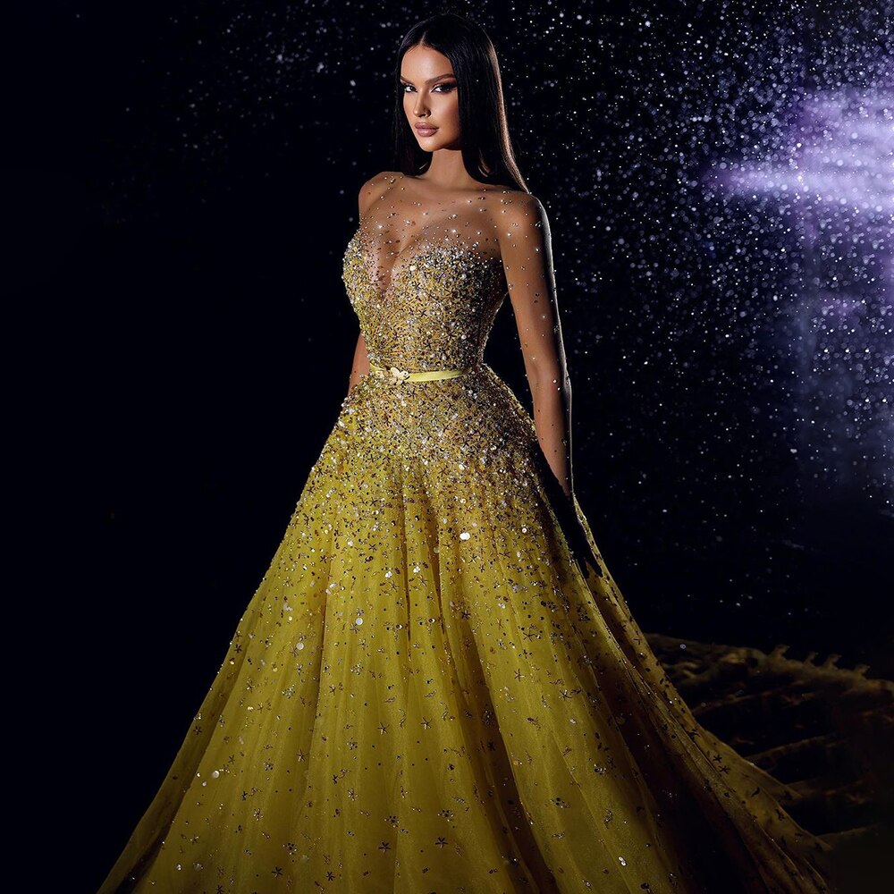 Robe de soirée de luxe à perles, style arabe jaune, sexy, fendue haute, style Dubaï, pour femmes, fête de mariage, 2025, LA71916