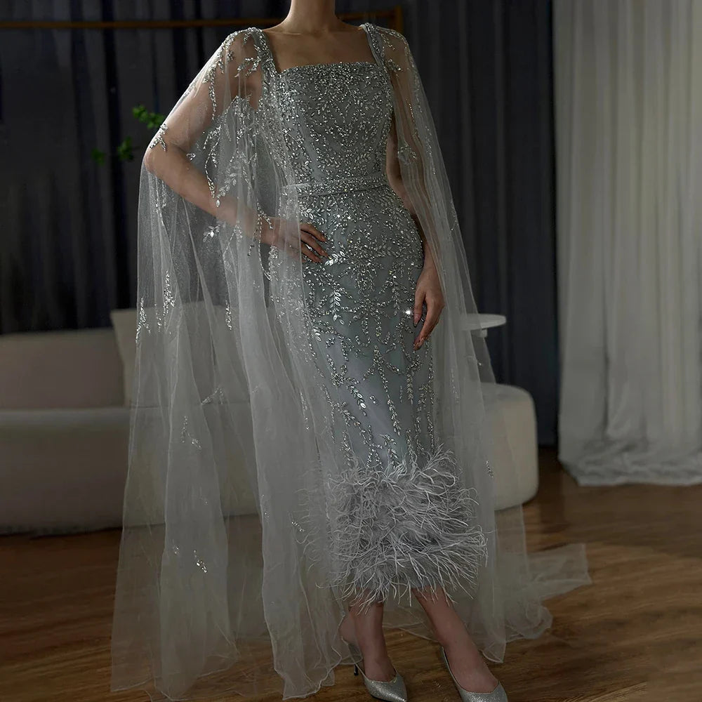 Robe de soirée de luxe lilas sirène longueur cheville, plumes et perles, avec cape LA71841