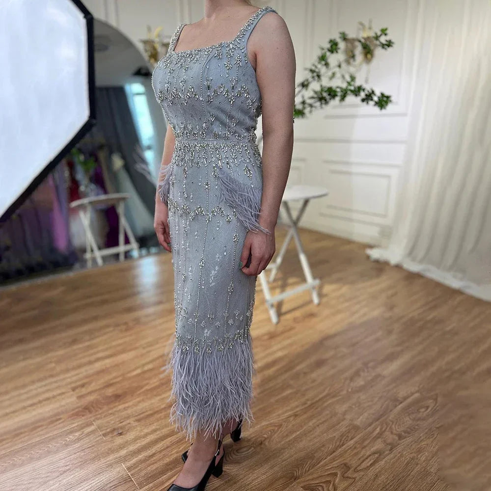 Robe de soirée mi-longue en dentelle bleue à plumes et cristaux de luxe, style arabe, LA71492A